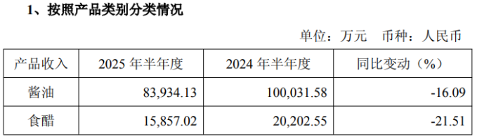 从产品端看,上半年公司两大核心品类增长动能失速,成为导致其经营承压的关键因素。报告期内,公司酱油产品实现收入8.39亿元,同比大幅下滑16.09%;食醋贡献收入1.59亿元,同比大幅下降21.51%,其中在第二季度,酱油和食醋营收分别同比下降31.06%和35.40%,同比降幅环比一季度进一步扩大。