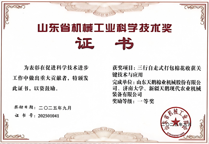 2025年12月12日,由 中国机械工业联合会 、 山东省工业和信息化厅 指导, 山东省机械工业协会 主办的2025山东省机械工业创新发展大会暨 山东省机械工业协会 年会在济南召开。大会对年度机械工业科学技术奖、大学生装备制造业创新大赛等奖项以及行业科技创新先进典型进行了表彰,山东天鹅棉业机械股份有限公司牵头的“三行自走式打包棉花收获关键技术与应用”项目荣获山东省机械工业科学技术奖一等奖。