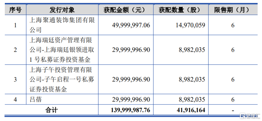 格隆汇9月7日丨全筑股份(603030.SH)公布非公开发行股票发行情况报告暨上市公告书,确定此次发行价格为3.34元/股,发行数量为4191.62万股,募集资金总额为1.4亿元。此次发行最终确定发行对象为4家,此次发行的最终配售结果如下: