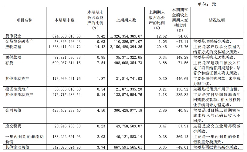 报告期内,全筑股份实现营业收入40.42亿元,归属于上市公司股东的净利润为-12.93亿元,为5年来首次出现亏损。货币资金下滑34%至8.7亿元,应收票据约13.4亿元,经营活动产生的现金流量净额由正转负。
