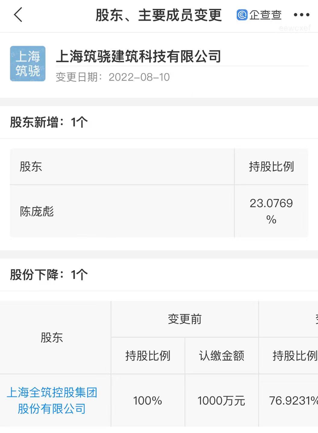 8月10日,上海全筑控股集团股份有限公司(以下简称“全筑股份”)转让上海筑骁建筑科技有限公司(以下简称“筑骁建筑”)23.08%股权,陈庞彪接盘。