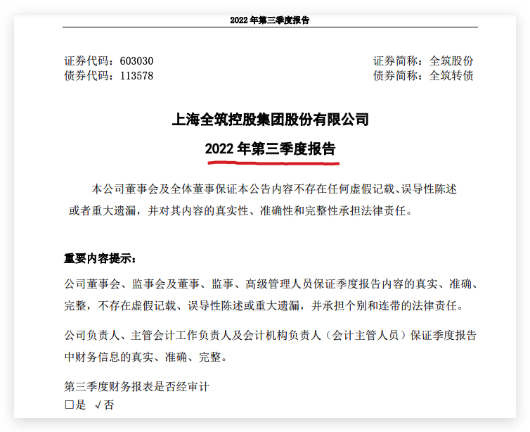 全筑股份(603030.SH)发布2022年第三季度报告显示,因受行业及第一大客户影响,公司业务缩减等致营收大幅下降及净利润亏损达7.1亿元。