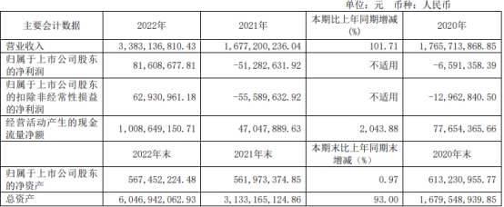 安孚科技2022年营业收入为33.83亿元,同比增长101.71%;归属于上市公司股东的净利润为8160.87万元,上年同期为-5128.26万元;归属于上市公司股东的扣除非经常性损益的净利润为6293.10万元,上年同期为-5558.96万元;经营活动产生的现金流量净额为10.09亿元,同比增加2,043.88%。