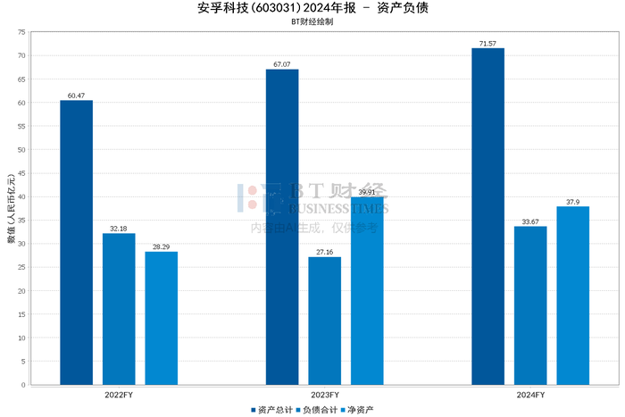 在资产负债方面,2024年末安孚科技的总资产为71.57亿元,同比增长6.71%。负债合计为33.67亿元,资产负债率从2023年的40.49%上升至47.05%。这表明公司在扩张过程中增加了负债,但资产增长速度仍高于负债增长速度,显示出一定的财务稳健性。此外,货币资金增加了118.72%,主要由于经营积累和银行贷款补充运营资金所致。