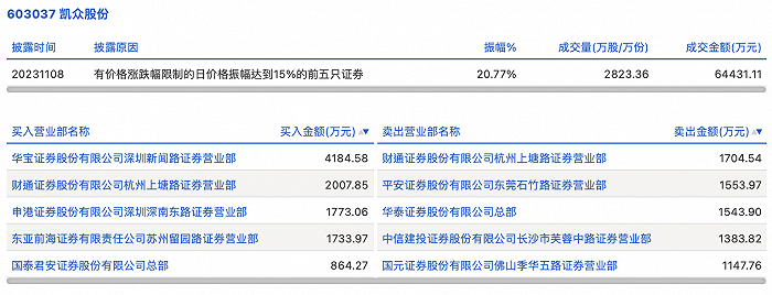 11月8日,凯众股份今日涨停,全天换手率达20.79%,振幅达18.92%。龙虎榜数据显示,营业部席位合计净买入3229.72万元。其中,华宝证券深圳新闻路证券营业部、财通证券杭州上塘路证券营业部分别买入4184.58万元、2007.85万元;财通证券杭州上塘路证券营业部、平安证券东莞石竹路证券营业部分别卖出1704.54万元、1553.97万元。