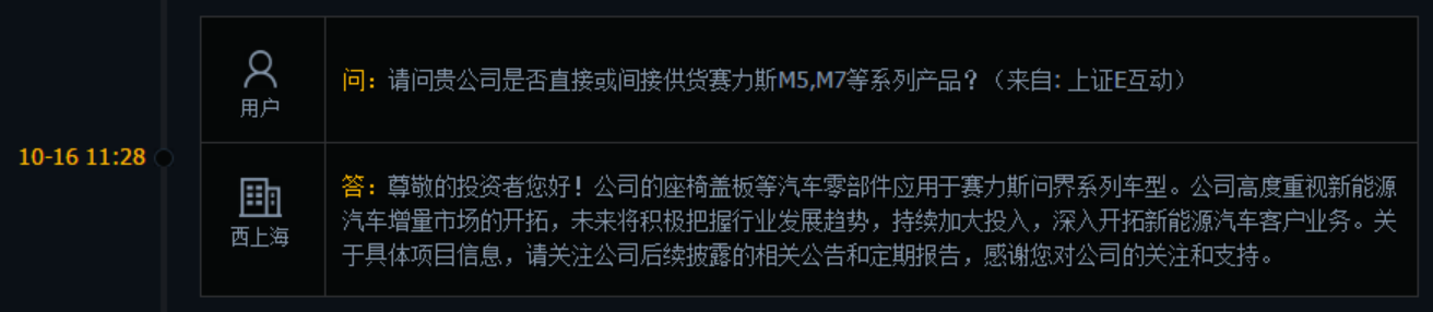 10月16日有投资者在上证e互动上向西上海进行提问:“请问贵公司是否直接或间接供货赛力斯M5,M7等系列产品?”西上海在回复的内容中提及,“公司的座椅盖板等汽车零部件应用于赛力斯问界系列车型。”公司的股价在交易日当天上涨 3.05%,并且在10月18日收获涨停。