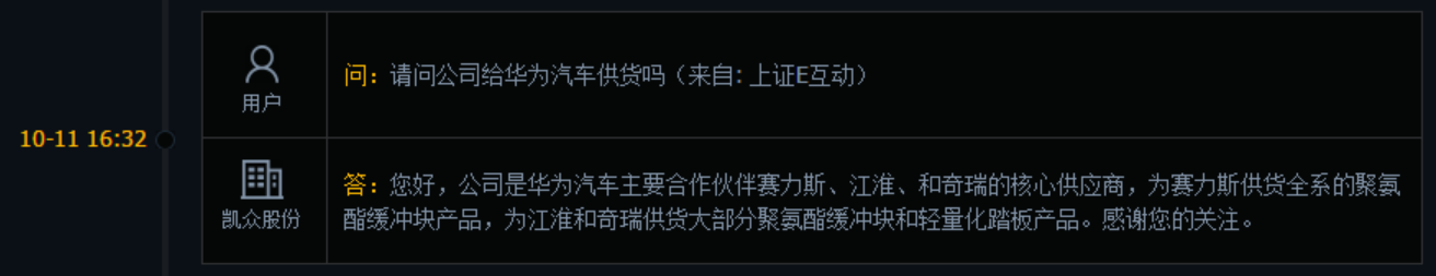 10月11日,有投资者在上证e互动上提问,“请问公司给华为汽车供货吗”,凯众股份在回复中表示,“公司是华为汽车主要合作伙伴赛力斯、江淮、和奇瑞的核心供应商,为赛力斯供货全系的聚氨醋缓冲块产品,为江淮和奇瑞供货大部分聚氨醋缓冲块和轻量化踏板产品。”