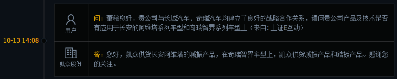 2天后,有投资者提问:“公司产品及技术是否有应用于长安的阿维塔系列车型和奇瑞智界系列车型上”。公司方面的回复,“在奇瑞智界车型上,凯众供货减震产品和踏板产品”。