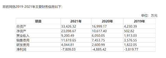 而且更关键的是,从投资人的角度来看,大家最担心的恐怕并不是被投企业亏损了多少,真正更让人不安的是:在盈亏拐点遥遥远期的情况下,原本收入增长可以掩盖利润亏损的被投标的的营收也停涨了——事实上,亘岩网络确实是个持续亏损的企业,且其亏损额较其营收规模而言还十分惊人:2019年-2021年间,亘岩网络的亏损额分别达到了3819.77万元、4885.42万元和7809.03万元。