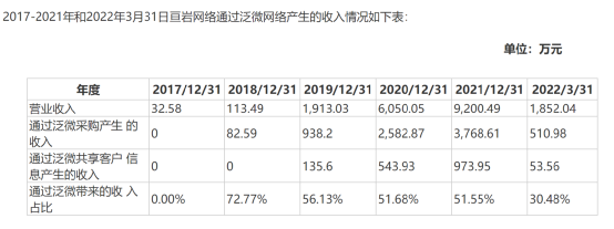 2019年开始,亘岩网络的营业收入开始“起飞”,当年实现营收1913.03万元,2020年和2021年,其营收更是分别增长至6050.05万元和9200.49万元——只不过,亘岩网络的这些收入大部分都来自ST泛微:根据ST泛微回复上交所的材料,2019年-2021年间,来自ST泛微的业务收入占亘岩网络总营收的比重分别达到了56.13%、51.68%和51.55%,2018年的这一比例更是高达72.77%。