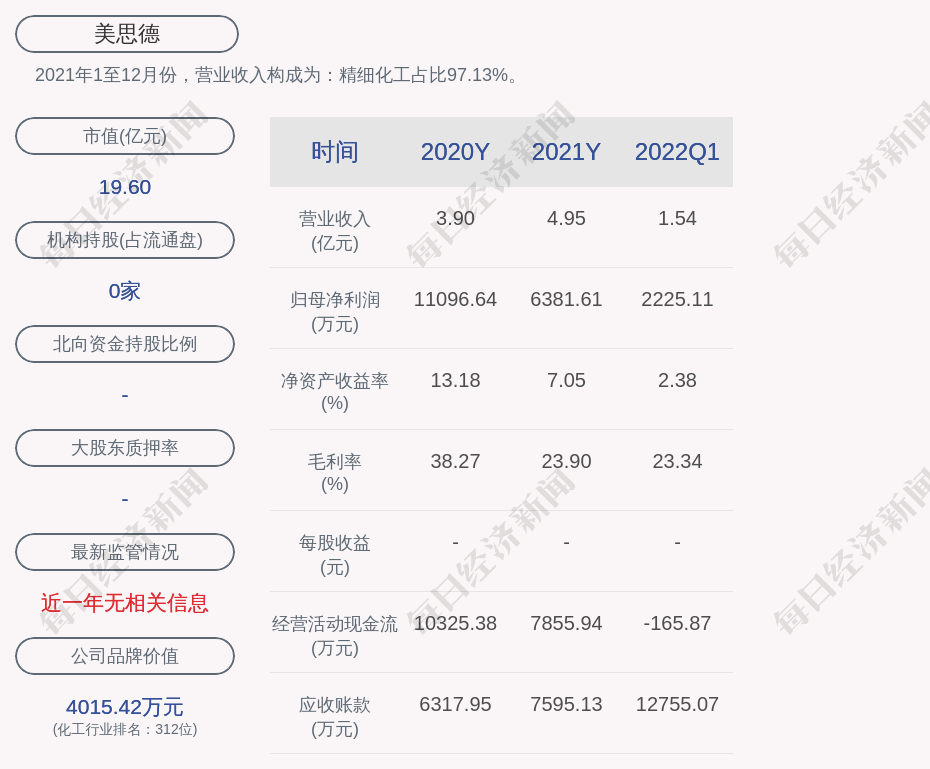 2021年1至12月份,美思德的营业收入构成为:精细化工占比97.13%。