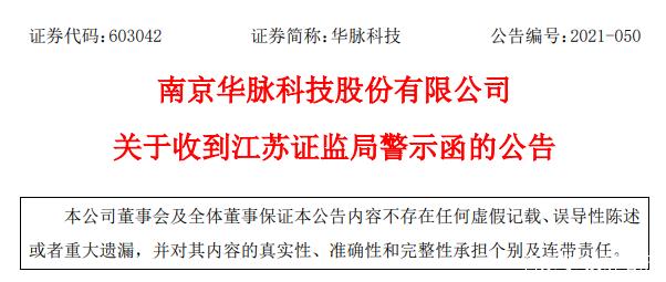 8月10日,南京华脉科技股份有限公司(603042.SH,简称“华脉科技”)发布收到江苏证监局警示函公告。