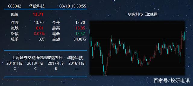 华脉科技成立于1998年,2017年6月2日在上海证券交易所主板A股上市,上市后的华脉科技信息披露质量不佳。据投研电讯信披质量研究院统计,自上交所2016年度开展信息披露考评工作以来,华脉科技于2017-2018年度在上交所信息披露考评为B,但在2018-2019年度信息披露考评由B下降为C后,已连续两年在上交所信息披露考评中被评为C。