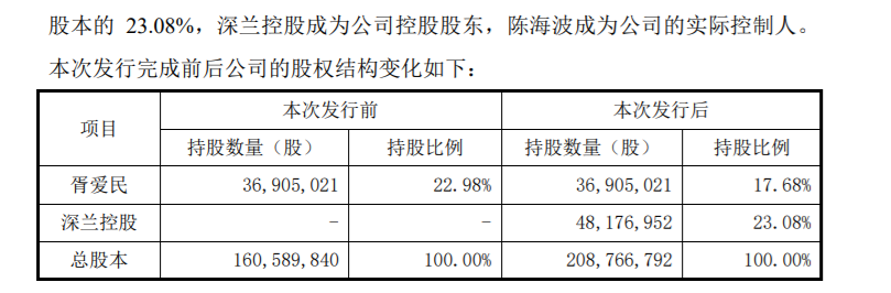 6月20日晚间,该重大事项揭晓。华脉科技拟向深兰控股非公开发行4817.70万股,占上市公司目前总股本的30%。发行完成后,华脉科技控股股东、实际控制人胥爱民持有公司股份比例由22.98%降为17.68%。而深兰控股持股比例将升至23.08%,成为上市公司控股股东。