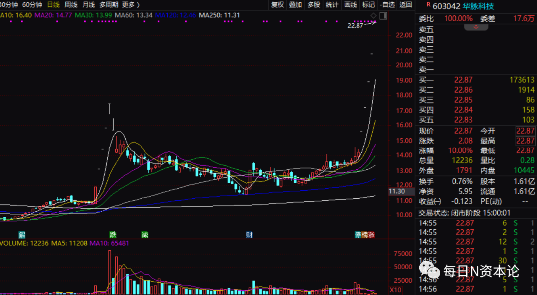 这是华脉科技连续第五个一字涨停板。从5月25日开始,华脉科技就开始串阳走势。6月5日到6月16日,做了一个短期平台整理后。6月21日,其便开始连续涨停。6月29日,华脉科技股价以涨停板开盘,并一字板保持到收盘。截至当日收盘,其股价为22.87元,上涨10%,总市值36.73亿元。