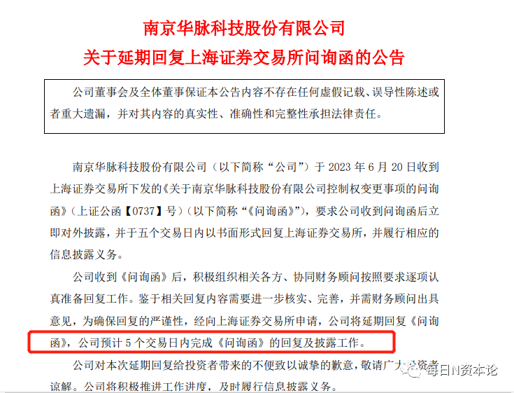 最新消息,6月30日,华脉科技发布“关于延期回复上海证券交易所问询函的公告”,其于6月20日收到上交所的问询函,经申请,公司将延期回复《问询函》,公司预计5个交易日内完成《问询函》的回复及披露工作。