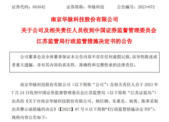根据《上市公司信息披露管理办法》(证监会令第182号)第五十一条、第五十二条的规定,江苏证监局对华脉科技及杨位钢、朱重北、杨勇、陈革等出具警示函,并记入证券期货市场诚信档案,要求高度重视,严格按照相关法律、行政法规和证监会有关规定,强化规范运作意识,加强对证券法律法规的学习,保证披露信息真实、准确、完整,并在收到决定书之日起10个工作日内提交书面报告。