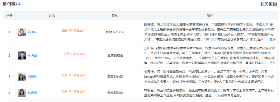 值得注意的是,陈海波并没耀眼的AI技术背景。信息显示,与商汤、科大讯飞等AI巨头大批知名AI专家坐阵不同,深兰科技核心团队一共才4人,具有较强技术背景与履历的成员只有首席战略官王昕磊一人。与此同时,深兰科技还深陷21起司法纠纷。