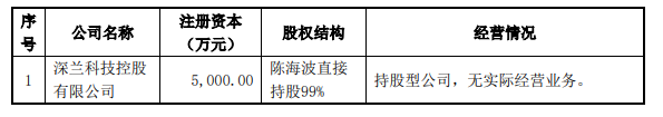 据问询回复函披露,深兰控股在今年3月21日才成立,为持股型公司,无实际经营业务,最近一年一期未有财务数据,实控人陈海波持股99%。