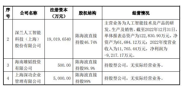 据公司回复函、官网披露,作为深兰科技创始人、首席执行官,陈海波直接持股46.74%,公司深度布局智能驾驶、智能机器人、AI元宇宙和智能大健康等。曾有媒体将公司与商汤科技、科大讯飞(002230)并称为“人工智能三巨头DSK”,今年深兰科技还上榜“全球独角兽500强排行榜”。