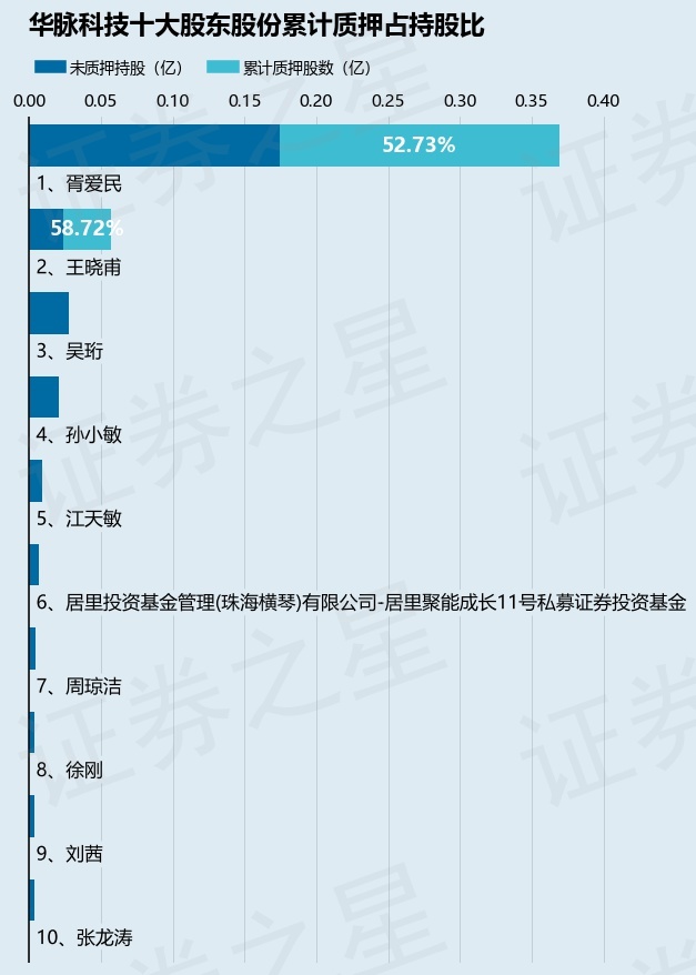 截止本公告日,股东胥爱民已累计质押股份1946.0万股,占其持股总数的52.73%,股东王晓甫已累计质押股份336.0万股,占其持股总数的58.72%。本次质押后华脉科技十大股东的累计质押股份占持股比例见下图: