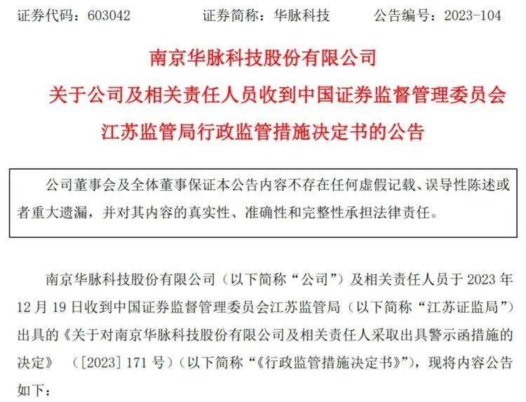 华脉科技12月20日晚间公告,公司及相关责任人收到江苏证监局出具的《关于对南京华脉科技股份有限公司及相关责任人采取出具警示函措施的决定》(以下简称《行政监管措施决定书》)。