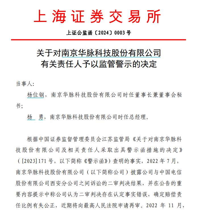 公告显示,根据江苏证监局《关于对南京华脉科技股份有限公司及相关责任人采取出具警示函措施的决定》查明的事实,2022年7月,华脉科技披露公司与中国电信股份有限公司西安分公司之间诉讼的二审判决结果,并在公告的重要内容提示中称公司认为二审判决存在认定事实错误,确定赔偿责任比例有失公正,近期将向最高人民法院申请再审。2022年11月,公司已决定放弃向法院申请再审,但直至2023年4月,公司才发布会计差错更正公告,且直至2023年6月,公司才在《关于对公司2022年年度报告的信息披露监管问询函的回复公告》中披露公司放弃向最高人民法院申请再审的信息。