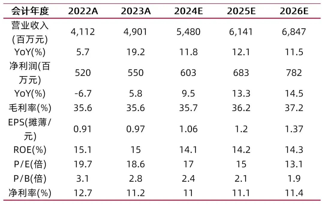 继续看好公司食品+餐饮双主业协同发展,餐饮线下业务有序恢复,食品制造业务产能扩张、连锁门店增加、经销商跨区域发展带动公司走出华南、布局全国。我们预计公司2024-2026年EPS分别为1.06\1.2\1.37元,对应公司4月26日收盘价18元,2024-2026年PE分别为17\15\13.1倍,维持“增持-A”评级。
