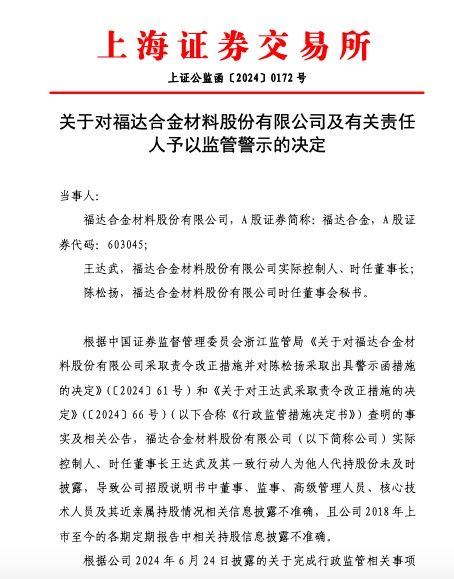 上交所相关决定称,根据中国证券监督管理委员会浙江监管局《关于对福达合金材料股份有限公司采取责令改正措施并对陈松扬采取出具警示函措施的决定》(〔2024〕61号)和《关于对王达武采取责令改正措施的决定》(〔2024〕66号)(以下合称《行政监管措施决定书》)查明的事实及相关公告,福达合金材料股份有限公司(以下简称公司)实际控制人、时任董事长王达武及其一致行动人为他人代持股份未及时披露,导致公司招股说明书中董事、监事、高级管理人员、核心技术人员及其近亲属持股情况相关信息披露不准确,且公司2018年上市至今的各期定期报告中相关持股信息披露不准确。