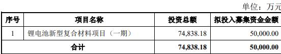 本次向不特定对象发行可转债拟募集资金总额不超过50,000.00万元(含本数),扣除发行费用后募集资金净额将用于锂电池新型复合材料项目(一期)。