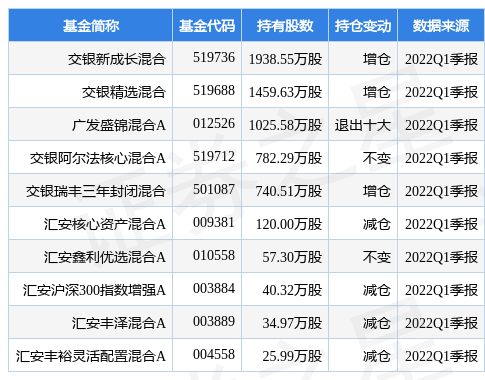 其中持有数量最多的基金为交银新成长,目前规模为93.34亿元,最新净值3.819(6月10日),较上一交易日上涨2.36%,近一年下跌18.01%。该基金现任基金经理为王崇。