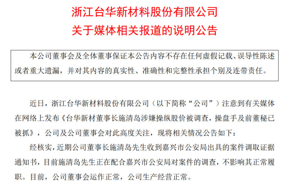 3月19日,浙江台华新材料股份有限公司发布公告称,公司董事长施清岛先生正在配合嘉兴市公安局对案件的调查。
