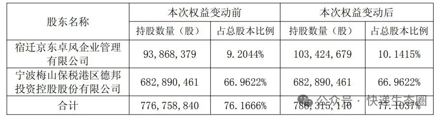 2025年4月11日至2025年4月25日,京东卓风通过集中竞价交易方式以专项贷款和自有资金增持公司股份9,556,300股,约占公司总股本的0.9371%,增持金额13,132.12万元。本次权益变动后,京东卓风直接持有公司股份103,424,679股,约占公司总股本的10.1415%,德邦控股及京东卓风合计持有公司股份786,315,140股,合计持有公司股份的比例从76.1666%增加到77.1037%。