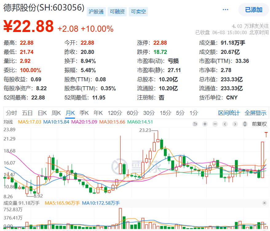 6月3日,德邦股份再次涨停,最新报22.88元/股,实现5连板。