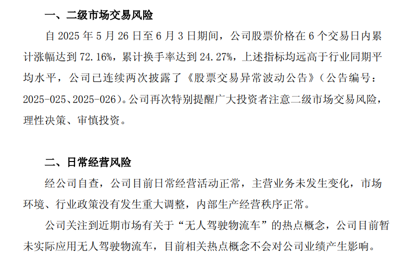经公司自查,公司目前日常经营活动正常,主营业务未发生变化,市场环境、行业政策没有发生重大调整,内部生产经营秩序正常。公司关注到近期市场有关于“无人驾驶物流车”的热点概念,公司目前暂未实际应用无人驾驶物流车,目前相关热点概念不会对公司业绩产生影响。