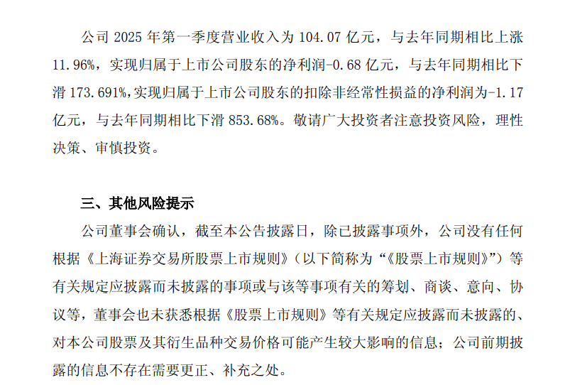 公司 2025 年第一季度营业收入为 104.07 亿元,与去年同期相比上涨11.96%,实现归属于上市公司股东的净利润-0.68 亿元,与去年同期相比下滑 173.691%,实现归属于上市公司股东的扣除非经常性损益的净利润为-1.17亿元,与去年同期相比下滑 853.68%。敬请广大投资者注意投资风险,理性决策、审慎投资。
