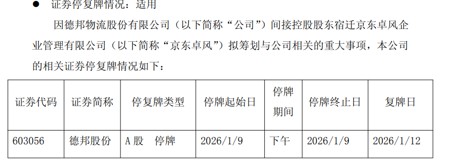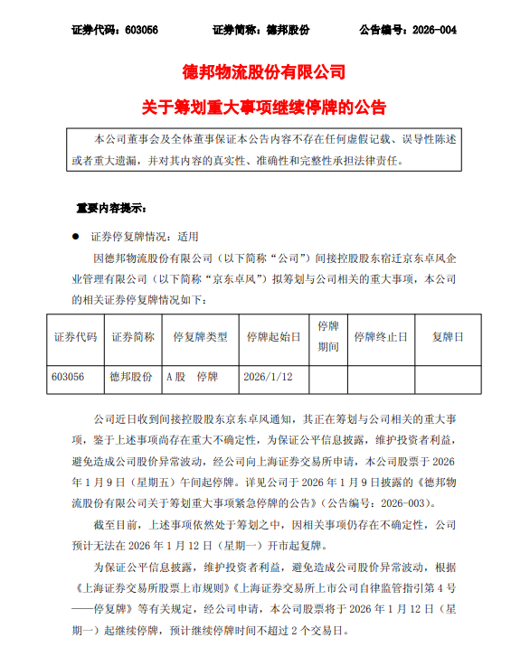 1月9日晚间,德邦股份自2026年1月12日开市起继续停牌,预计停牌时间不超过2个交易日,因间接控股股东京东卓风拟筹划与公司相关的重大事项,相关事项尚存在重大不确定性。