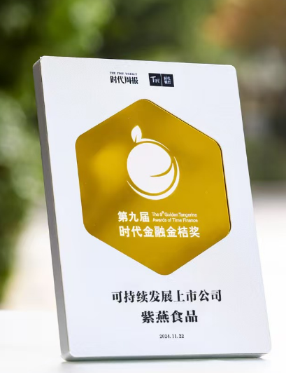 11月22日,由广东时代传媒集团有限公司发起的第九届“时代金融金桔奖”系列榜单重磅发布,紫燕食品(603057.SH)凭借在可持续发展领域的卓越表现,获评“可持续发展上市公司”。