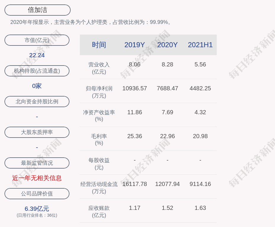 2020年年报显示,倍加洁的主营业务为个人护理类,占营收比例为:99.99%。