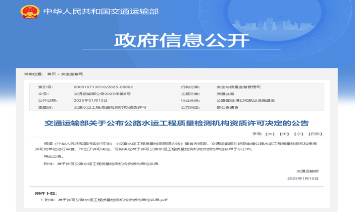 此次获批公路工程甲级质量检测资质,是国检集团在工程检测领域深耕细作、持续创新的有力证明,公司将继续践行央企担当,持续提升技术水平与服务质量,为推动我国交通建设事业高质量发展贡献更大力量。