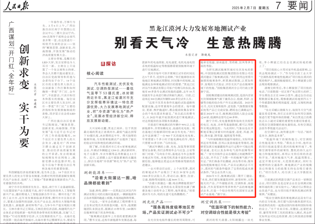 在祖国版图的最北端,黑龙江省漠河市犹如一颗璀璨的明珠,镶嵌在茫茫林海雪原之中。这里最低气温可达零下53摄氏度,冰封期半年以上,极寒的环境曾是人们生活和生产的挑战,如今却成为了发展“冷资源”的独特优势。近日,国检集团漠河极寒测试园因出色的创新发展实践登上了《人民日报》,成为了全国瞩目的焦点。