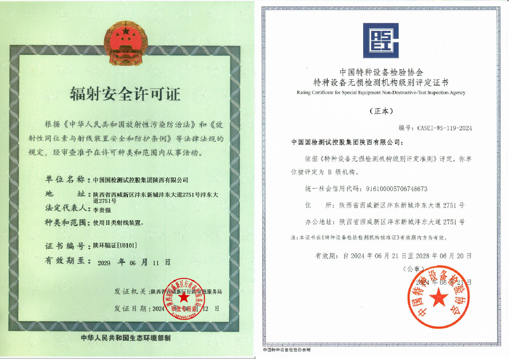 此次成功获取的两项重要资质——《特种设备检验检测机构核准证》(检测机构)及《特种设备检验检测核准证》(检验机构)综合甲类B1级,由陕西省市场监督管理局正式颁发。同时,国检集团西北运营中心(陕西公司)通过中国特种设备协会专家评审,获得《特种设备无损检测机构B级》资质,这一系列资质的取得,不仅彰显了国检集团在特种设备检验检测领域的专业实力与严谨态度,也为进一步开拓市场、提升服务品质定了坚实基础。