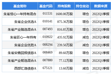 根据2022Q1季报基金重仓股数据,重仓该股的基金共8家,其中持有数量最多的基金为朱雀恒心一年持有混合。朱雀恒心一年持有混合目前规模为67.3亿元,最新净值0.8394(5月18日),较上一交易日下跌0.1%,近一年下跌13.7%。该基金现任基金经理为梁跃军黄昊。梁跃军在任的公募基金包括:朱雀企业优胜A,管理时间为2020年6月3日至今,期间收益率为33.32%;朱雀产业臻选混合A,管理时间为2020年6月29日至今,期间收益率为22.81%;朱雀企业优选A,管理时间为2020年9月23日至今,期间收益率为1.63%;朱雀匠心一年持有,管理时间为2020年12月21日至今,期间收益率为-14.14%。黄昊在任的公募基金包括:朱雀企业优选A,管理时间为2020年10月29日至今,期间收益率为0.18%;