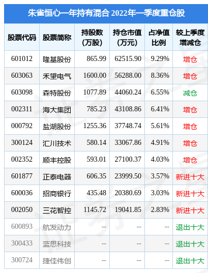 朱雀恒心一年持有混合的前十大重仓股如下: