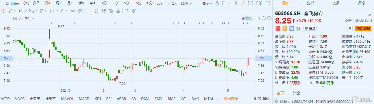 5月20日丨音飞储存(603066.SH)涨停,报8.25元创一个月新高,最新总市值24.8亿,现有封单2.4万手。公司19日公告称,拟以现金方式收购罗伯泰克全部股份,后者是行业领先的智能仓储物流存取设备制造商和整体解决方案提供商。