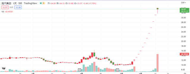 6月14日,海汽集团再次涨停,目前走势11连板,截至14日收盘,公司股价报34.29元/股,涨幅10.01%,总市值108.4亿元。而在一个月之前,也就是5月13日,公司收盘价仅为12.02元/股,也就是说,海汽集团12个交易日股价涨幅高达200.26%。