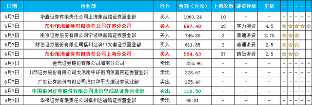 6月7日龙虎榜数据显示,买入榜中,实力游资“东亚前海证券有限责任公司江苏分公司”当日买入887.48亿元、最近3月上登上龙虎榜68次,游资评级4.5星。另一家顶级游资“东亚前海证券有限责任公司上海分公司”当日买入594.63万元、最近3月上登上龙虎榜57次,游资评级2.5星。值得注意的是在卖榜中,顶级游资“赵老哥”常用席位“中国银河证券股份有限公司北京阜成路证券营业部”当日卖出获利了结,按照目前最新估价来算,赵老哥卖飞至少五个板。
