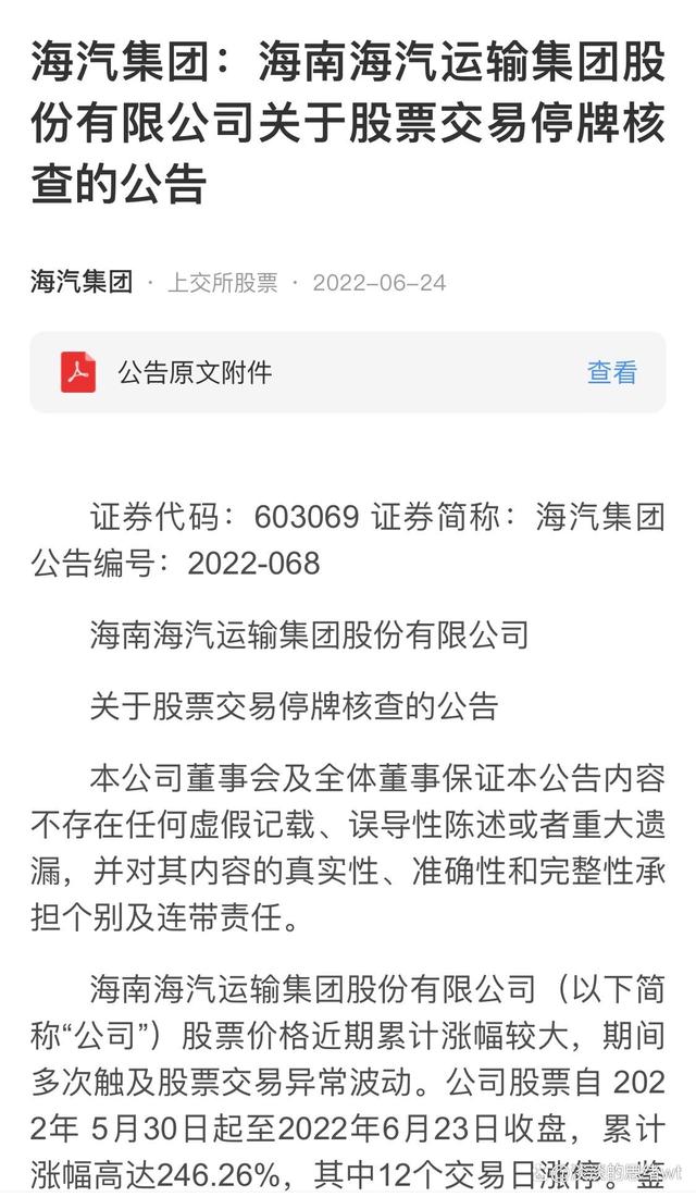 海汽集团终于用第13个涨停迎来了停牌核查,七天前已经12个涨停了还不检点一下,或许是高位涨累了,想用停牌核查这种方式来休息几天吧。