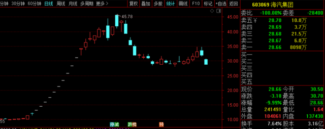 7月27日,海汽集团低开低走,10点多跌停,截止午间收盘,海汽集团报于28.66元,总市值为90亿。