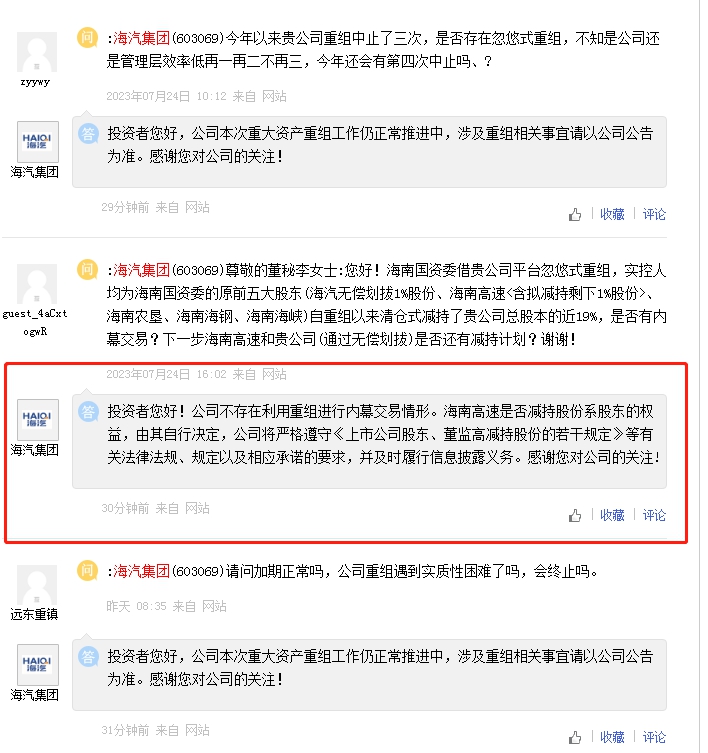 26日,海汽集团通过互动平台回应股东减持称,公司不存在利用重组进行内幕交易情形;海南高速是否减持股份系股东的权益,由其自行决定。